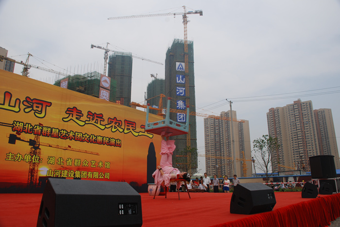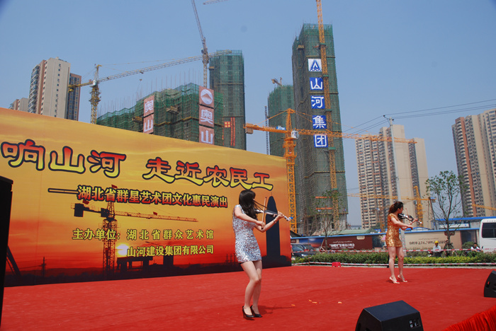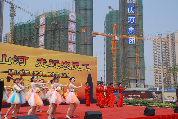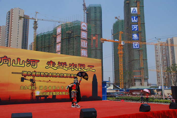 這次惠民演出是由湖北省群藝館與山河集團(tuán)共同舉辦,是山河集團(tuán)關(guān)愛農(nóng)民工的又一項(xiàng)舉措。湖北公司副總經(jīng)理柯為正在致辭中介紹說,作為房建施工總承包特級(jí)資質(zhì)企業(yè),山河集團(tuán)已發(fā)展成為投資或控股東升建設(shè)、竹安設(shè)備、益鵬置業(yè)等22家子公司,集建筑產(chǎn)業(yè)、房地產(chǎn)業(yè)、投資業(yè)務(wù)于一體的企業(yè)集團(tuán)。先后榮獲 “全國優(yōu)秀施工企業(yè)”、“全國重合同守信用企業(yè)”、“中國中部地區(qū)建筑業(yè)50強(qiáng)”,連續(xù)八年被湖北省人民政府評(píng)定為“建筑企業(yè)綜合實(shí)力20強(qiáng)”??驴傊赋觯煽?jī)的取得離不開所有曾經(jīng)和正在為公司發(fā)展而默默奮斗的廣大工友們。