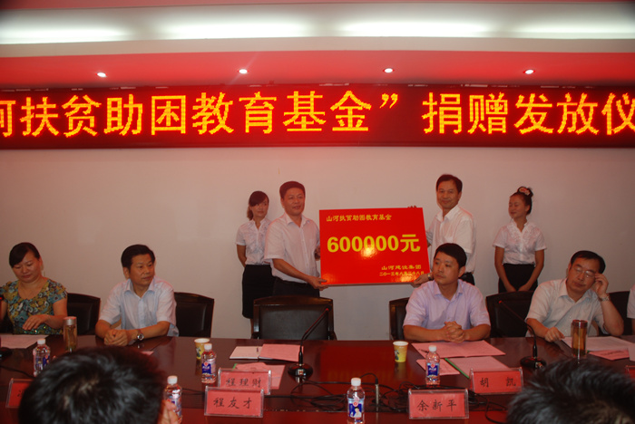 社會(huì)成就山河集團(tuán),山河集團(tuán)不忘社會(huì)。2006年8月,山河集團(tuán)與黃岡市總工會(huì)共同發(fā)起設(shè)立了“黃岡市總工會(huì)山河扶貧助學(xué)專項(xiàng)資金”。“山河扶貧助學(xué)專項(xiàng)資金”的設(shè)立,旨在建立一個(gè)長(zhǎng)效的助學(xué)機(jī)制,全力打造“愛(ài)心助學(xué)”品牌。8年來(lái),山河集團(tuán)從董事長(zhǎng)到基層員工,個(gè)個(gè)慷慨解囊,人人踴躍捐資,先后幫助2000多名貧困初中生順利進(jìn)入高中完成學(xué)業(yè)、貧困高中生邁進(jìn)大學(xué)校園實(shí)現(xiàn)人生夢(mèng)想。