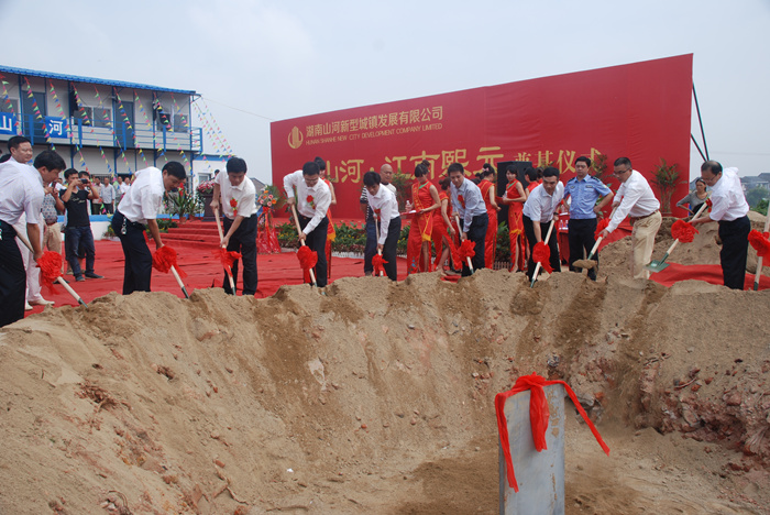 2013年9月8日上午,丹桂飄香,彩旗飄揚,在熱鬧歡騰的隆隆禮炮聲中,由山河集團總投資8億元打造的湖南茶陵“山河•江南熙元”項目,在茶陵縣江防護堤下瑤段舉行開工奠基儀式。