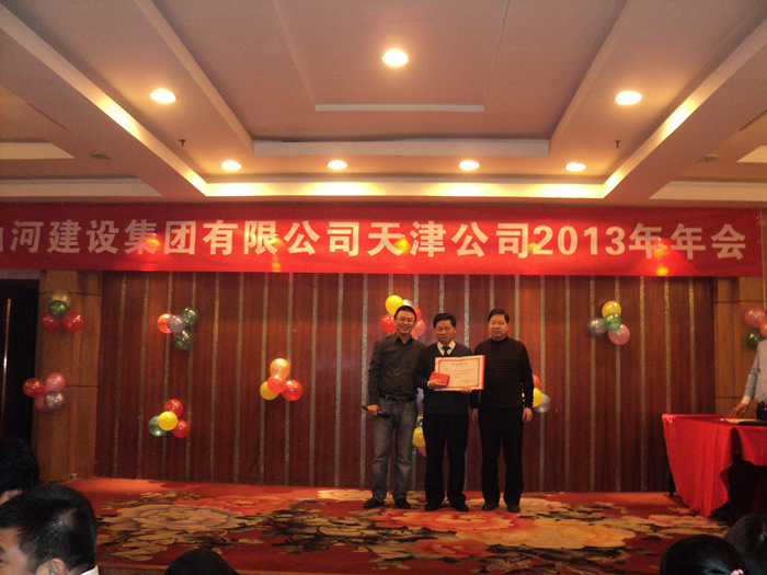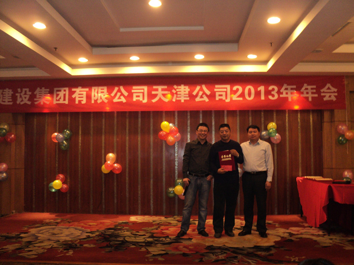 接下來是對2013年成績優秀的項目部進行表彰,他們是天津經綸科技項目部,天津軍交學院項目部,河北長城家園項目部。分別由天津公司總經理程震洪,集團公司副總兼天津公司總工史紹剛,天津公司黨委書記付志遠對以上項目部進行頒獎。