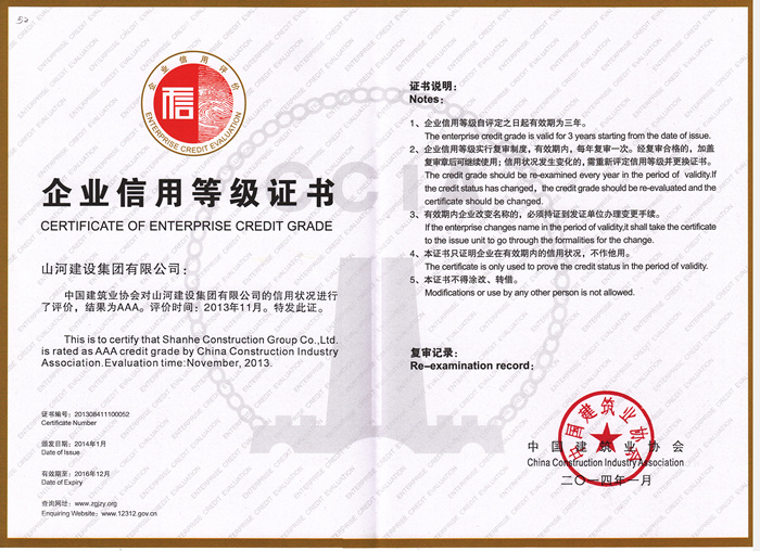 全國(guó)建筑業(yè)AAA級(jí)信用企業(yè)由中國(guó)建筑業(yè)協(xié)會(huì)頒發(fā),是建筑行業(yè)信用最高獎(jiǎng)項(xiàng)。此次評(píng)價(jià)嚴(yán)格按照《建筑業(yè)企業(yè)信用評(píng)價(jià)試行辦法》規(guī)定的程序進(jìn)行。經(jīng)企業(yè)自愿申報(bào)、各地區(qū)和有關(guān)行業(yè)、建筑業(yè)協(xié)會(huì)推薦、在建設(shè)系統(tǒng)相關(guān)網(wǎng)站上排查、專家評(píng)價(jià)組初評(píng)、全國(guó)建筑業(yè)企業(yè)信用評(píng)價(jià)工作指導(dǎo)委員會(huì)審定和網(wǎng)上公示。通過層層篩選,最終,包括山河建設(shè)集團(tuán)有限公司在內(nèi)的93家企業(yè)評(píng)定為2013年度全國(guó)建筑業(yè)AAA級(jí)信用企業(yè)。