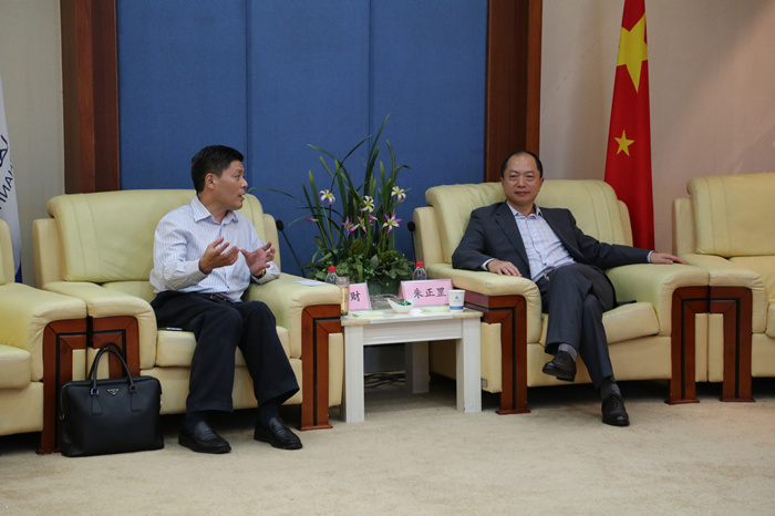 董事長(zhǎng)程理財(cái)(左)與中國(guó)農(nóng)業(yè)銀行湖北省分行行長(zhǎng)朱正罡(右)進(jìn)行親切交談