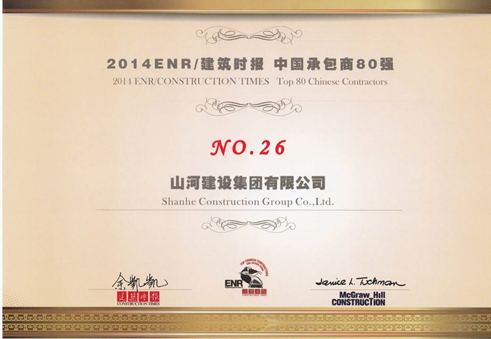 美國《工程新聞記錄》(ENR)和中國《建筑時報》兩家權威媒體共同主辦的2014年ENR/建筑時報“中國承包商80強和工程設計企業60強”排名于11月20日在北京揭榜。山河集團再次榜上有名,同比去年上升11位,排名列第26位,也是排行榜中湖北建筑企業第一名。
