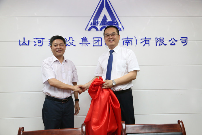 上午9:30,參觀河南公司辦公場所之后,山河集團董事長程理財和河南公司總經理馬文敏共同為河南公司揭牌。