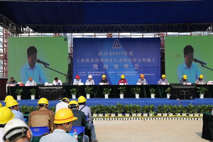 2015年10月22日上午,武漢市2015年度工程質(zhì)量治理兩年行動(dòng)暨安全文明施工現(xiàn)場(chǎng)觀摩會(huì)在山河集團(tuán)湖北公司匯通新長(zhǎng)江中心項(xiàng)目召開(kāi)。湖北省質(zhì)安總站副站長(zhǎng)周偉,武漢市稽查站總工程師曹立新、質(zhì)檢站處長(zhǎng)李華、安全站副站長(zhǎng)熊威,武昌區(qū)文明辦主任肖永高、安監(jiān)局局長(zhǎng)何學(xué)軍、建委書(shū)記周旗福、建委副局長(zhǎng)王水泉、建委副主任山峰,湖北新長(zhǎng)江置業(yè)有限公司董事長(zhǎng)陳學(xué)明,北京縱橫監(jiān)理有限公司副總經(jīng)理張忠,山河集團(tuán)董事長(zhǎng)程理財(cái)、副總經(jīng)理程秋明、湖北公司常務(wù)副總經(jīng)理柯為正、副總經(jīng)理羅定軍等領(lǐng)導(dǎo)參加了會(huì)議。武漢市建管辦楊凡主任主持會(huì)議。