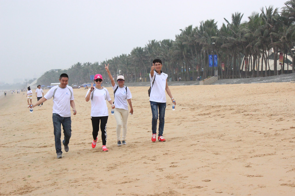 活動(dòng)當(dāng)天,碧海藍(lán)天微風(fēng)輕拂,參加徒步的員工一早便來(lái)到集合地點(diǎn),海南公司活動(dòng)線路設(shè)置在海口西秀海灘至貴族游艇會(huì),全程路段以沙灘為主。海南公司、??诤阏龑?shí)業(yè)公司及各項(xiàng)目部代表共計(jì)50人參加了徒步行的活動(dòng),比賽共分為15組,每個(gè)小組三人,其中有一名隊(duì)員必須是異性。為體現(xiàn)山河大家庭的氛圍,公司人員全部與項(xiàng)目部人員混編組隊(duì)。