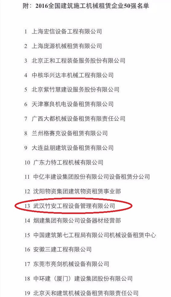 7月15日,由中國建筑業(yè)協(xié)會機械管理與租賃分會組織開展的“2016年全國建筑機械50強”評選活動揭曉。武漢竹安設(shè)備管理有限公司再度榮獲“全國建筑施工機械租賃50強企業(yè)”榮譽稱號,位列第13名。