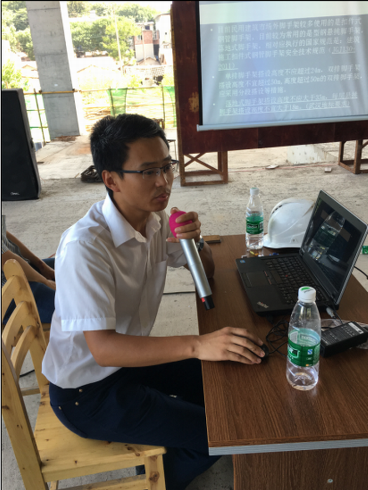 最后,湖北公司安全部主管楊根源就當前各個項目的外架搭設情況進行了匯報,并重點分析了外架搭設中存在的通病以及腳手架的搭設和安全防護措施。