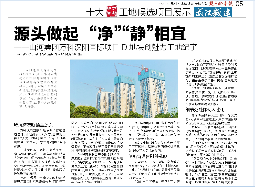 漢陽龍陽大道與陶家嶺路交匯處,山河集團承建的萬科漢陽國際項目D地塊3棟超高住宅樓已巍然挺立。該項目部從源頭抓起,創新管理和建造模式,長期將工地PM10控制在80以內,噪音控制在60分貝以下,讓整個工地既干凈,又安靜。