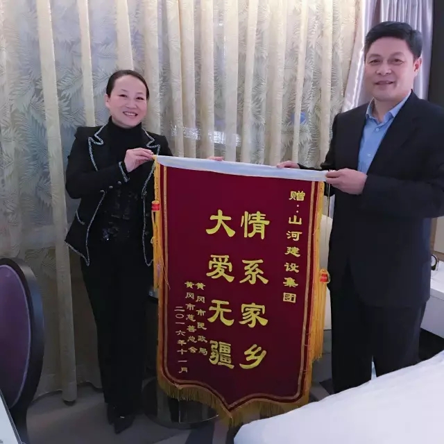 會后,黃岡市民政局局長石巧珍向程理財轉交市委市政府的感謝信,并代表民政局及市慈善總會向山河集團贈送榮譽錦旗一面,感謝山河集團在今年黃岡遭受嚴重洪澇災害時作出的無私奉獻。