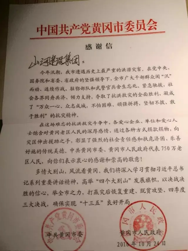 山河集團在這場難忘的抗洪救災斗爭中,通過各種方式捐款捐物,伸出援助之手,其中飽含了對黃岡老區人民的深厚感情,更彰顯了強烈的社會責任感與作為“中國500強”的企業擔當。