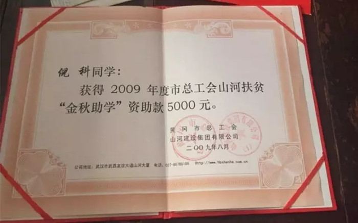 倪科全家6口人,年近九旬的爺爺奶奶長年臥病在床,父母是黃州區食品公司下崗工人,哥哥患有腦癱,家境一直十分窘迫。2009年,倪科考上清華,在市總工會的幫助下,他申請到山河集團5000元的助學金,順利地走進了大學校門。