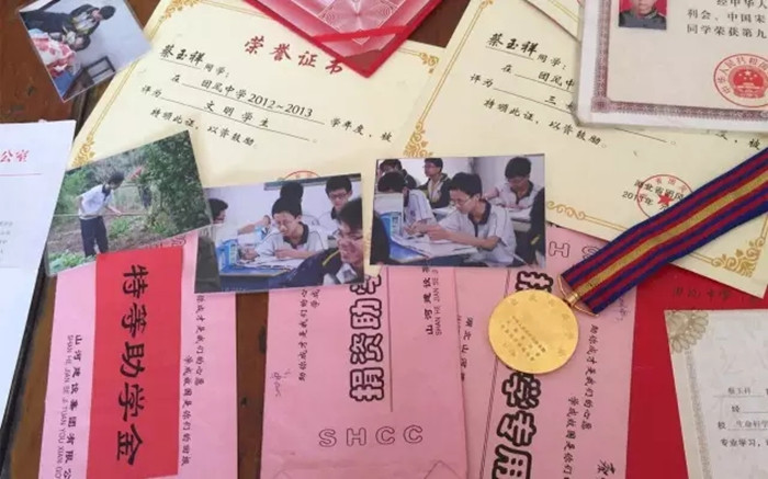 受助學生蔡玉祥獲得的各種獎狀及獎牌