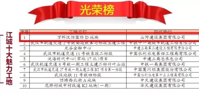 12月25日,2016年江城十大魅力工地十大智慧工地評選活動在楚天傳媒大廈舉行頒獎典禮,由山河集團承建的萬科漢陽國際D地塊項目位列十大魅力工地榜首,再獲殊榮。