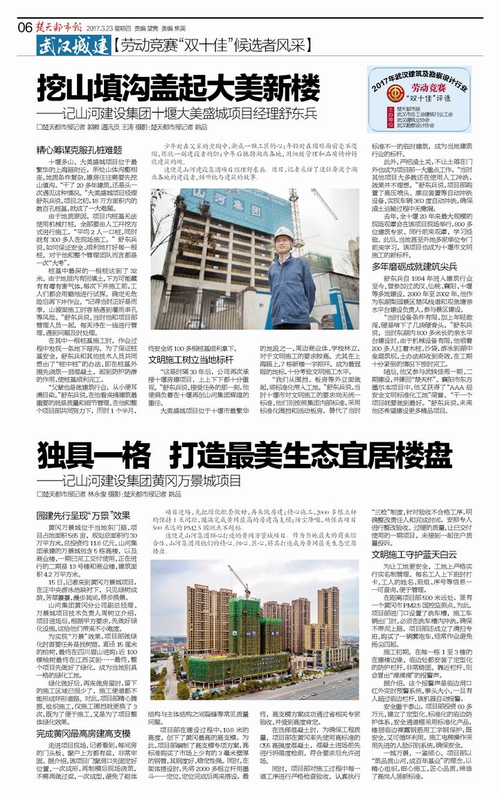 今天(3月23日)出版的楚天都市報,在顯著位置(06版),以整個版面的篇幅重點展示了山河集團在武漢建筑及勘察設計行業勞動競賽“雙十佳”中候選者的風采,候選者包括“十佳建設者”和“十佳建設項目”,標題分別為《挖山填溝蓋起大美新樓――記山河建設集團十堰大美盛城項目經理舒東兵》、《獨具一格打造最美生態宜居樓盤――記山河建設集團黃岡萬景城項目》。