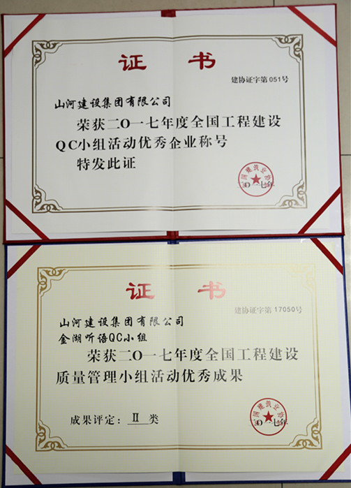 2017年全國工程建設優秀QC小組活動成果交流會第二場于今年7月1日-3日在四川成都舉行,經過中國建筑業協會工程建設質量管理分會和專家的評審,山河集團湖北公司參與發布交流的金湖聽雨項目的“提高外墻內保溫薄塊驗收合格率”榮獲2017年度全國工程建設質量管理小組活動優秀成果(成果評定為二類)。與此同時,山河建設集團有限公司被授予2017年度全國工程建設QC小組活動優秀企業稱號。