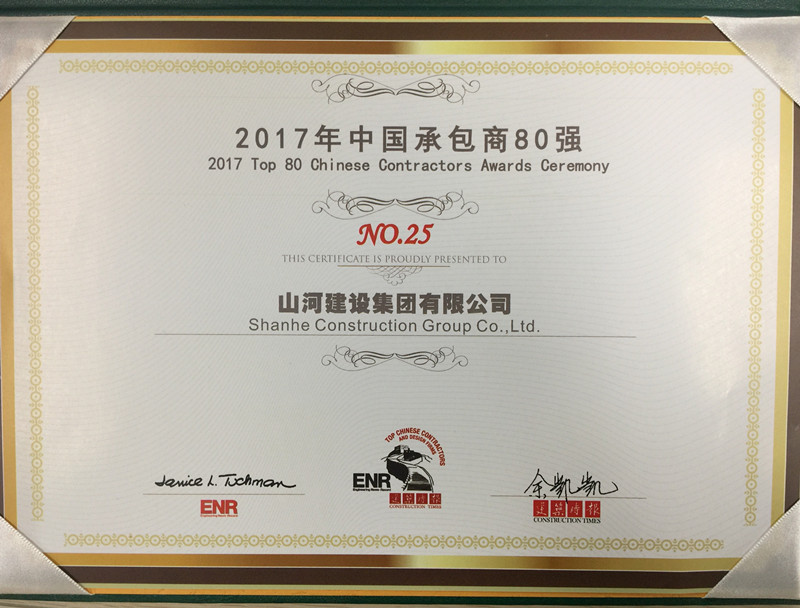 11月30日,美國《工程新聞記錄》(ENR)和中國《建筑時報》兩家權威媒體合作舉辦的2017ENR/建筑時報“中國承包商80強和工程設計企業60強”頒獎典禮在江蘇省蘇州市舉行。山河集團位列中國承包商80強第25位。