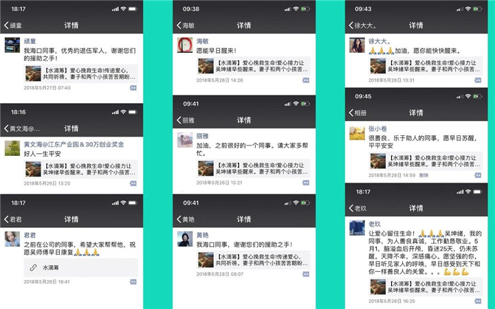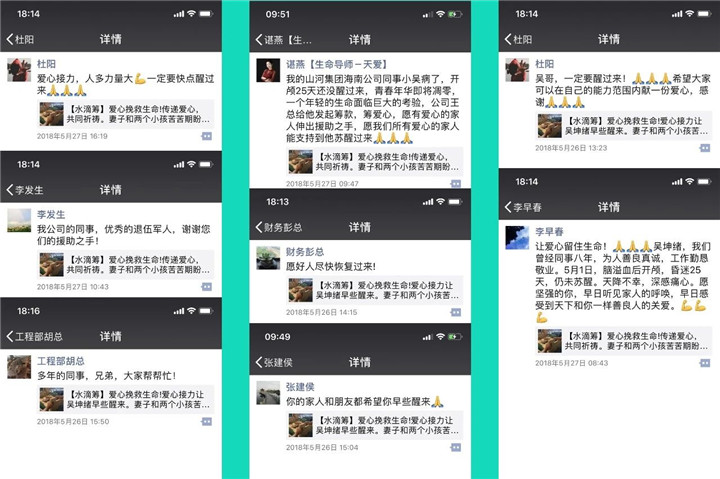 他的遭遇牽動著海南公司原同事們的心。海南公司員工紛紛自發(fā)為他募捐,并爭相用微信轉(zhuǎn)發(fā)他的病情,集團(tuán)員工朋友圈一度被自發(fā)援助吳坤緒的愛心舉動刷屏。