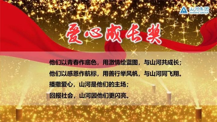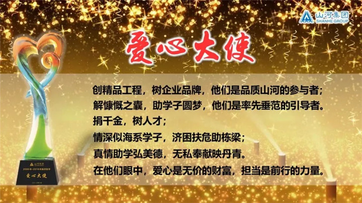答謝宴現場還給“全體山河人”頒獎,這個獎,看似平實,但意義非凡。年年金秋開學季,每當集團的捐資助學倡議書發出,無論天山河海,萬水千山,都阻擋不了山河人愛的腳步,全體山河人都會發起一股巨大的能量――奉獻愛,齊出發。