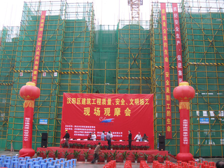 為進(jìn)一步全面提高漢陽區(qū)建筑工程質(zhì)量、安全、文明施工水平,漢陽區(qū)建管站于2006年10月17日上午,在湖北山河集團水墨丹青項目部工地現(xiàn)場召開了質(zhì)量、安全、文明施工現(xiàn)場觀摩會。市建管辦、市市場站、市質(zhì)監(jiān)站、市安全站,漢陽區(qū)委、區(qū)政府、區(qū)人大、區(qū)政協(xié)有關(guān)領(lǐng)導(dǎo)均到會表示祝賀。漢陽區(qū)各建設(shè)單位、施工單位、監(jiān)理單位相關(guān)負(fù)責(zé)人參加了會議。