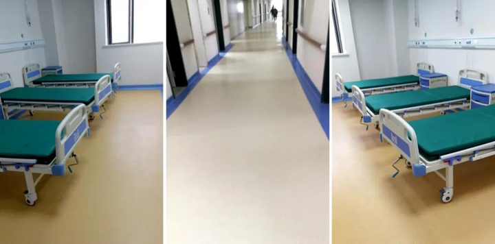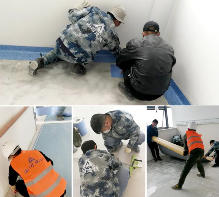 施工現場,多類工種各司其職,搶抓建設。突擊隊到達后,承擔起醫院住院大樓的部分地面鋪裝任務,需要鋪裝地板膠的面積約3600平方米。分配好工作任務,大家立即投入到緊張的施工中,清潔地面、檢測地坪、預鋪裁割、上膠、滾壓,每一道工序都一絲不茍。時間緊、任務重,那就加班加點,即使再苦再累,也要按照時間節點保質保量完成施工目標,這是山河人一貫的作風。
