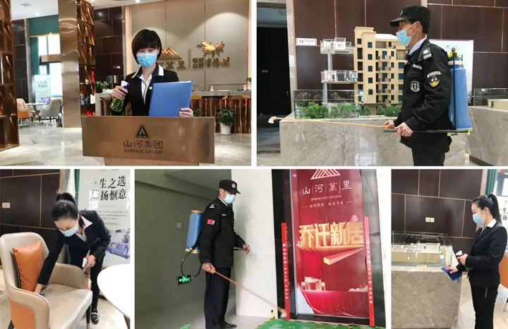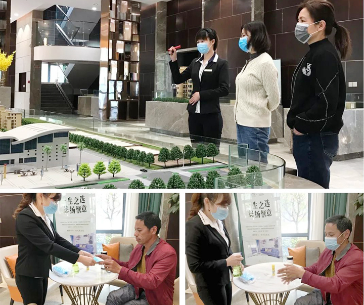 2.從停車場到前臺、售樓處沙盤、接待區、辦公室等公共區域每天進行兩次全方位、零死角的消毒處理,小到門把手、桌椅板凳等也不放過,通過高頻次的消毒,降低交叉感染風險,不留安全隱患。