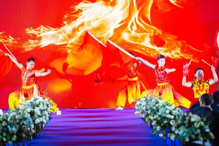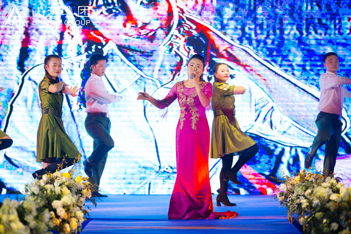 在鑼鼓喧天中,一面面紅旗接踵而至,宛如祖國山河建設(shè)崛地而起,開場舞《旗開得勝》拉開了年會的序幕,預(yù)示著新的一年旗開得勝,馬到成功。