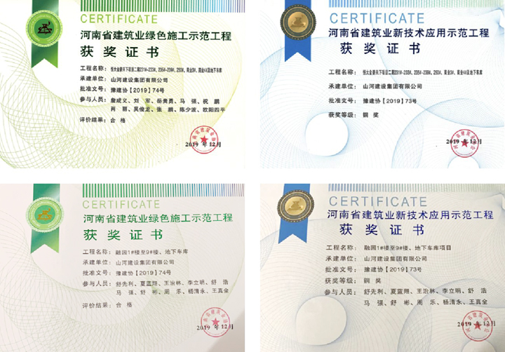 公司承建的恒大金碧天下項目、融創融園項目分別榮獲河南省綠色施工示范工程、河南省新技術應用銅獎各1項。這兩個項目在滿足立項要求后積極準備立項工作,施工過程中嚴格按照《河南省建筑業綠色施工示范工程管理辦法(試行)》《河南省建筑業新技術應用示范工程管理辦法》的要求,堅持高標準建設,確保高質量完工,及時收集并準備評審資料,順利通過了評審。