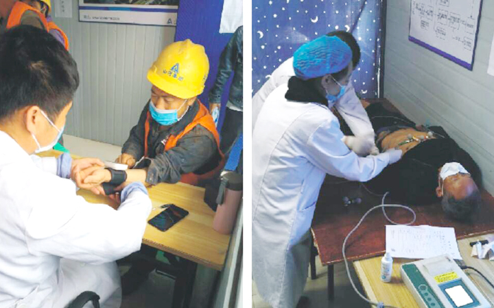 由重慶聚寧醫院的醫師和工作人員組成的七人體檢團隊來到工地,為大家進行了體溫、血常規、心電圖、生化檢查、內外科常規檢查、視力等項目的檢查。體檢過程中,有專人負責維護排隊的安全距離,避免交叉感染風險。