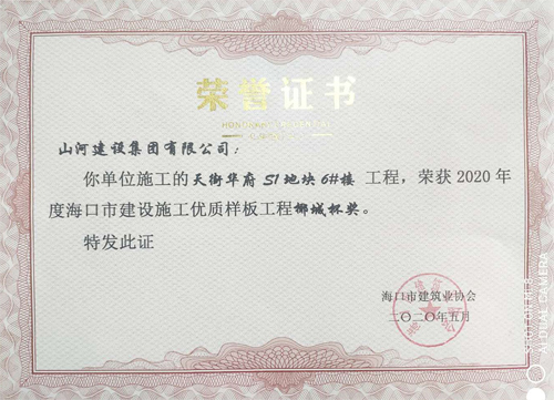 5月13日,山河建設集團海南公司承建的天街華府S1地塊6#樓喜獲2020年度海口市建設施工優質樣板工程“椰城杯”獎項,這是海口市建設工程質量最高榮譽。