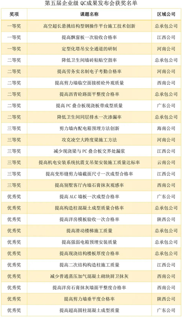 經過評審組專家點評、打分等環節,共評出企業級QC成果一等獎3項、二等獎6項、三等獎6項、優秀獎11項,山河杯銀獎1項、銅獎3項,標桿工程一等獎1項、二等獎2項、三等獎2項,智慧工地一等獎1項、二等獎2項、三等獎3項。