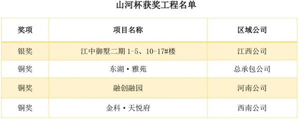 山河杯:“山河杯”是集團工程質量最高獎項,要求申報項目達到一定規模,完成竣工驗收備案,經過一年使用沒有發現質量缺陷和質量隱患,獲得項目所在地優質結構工程、優質建筑工程質量獎項等。
