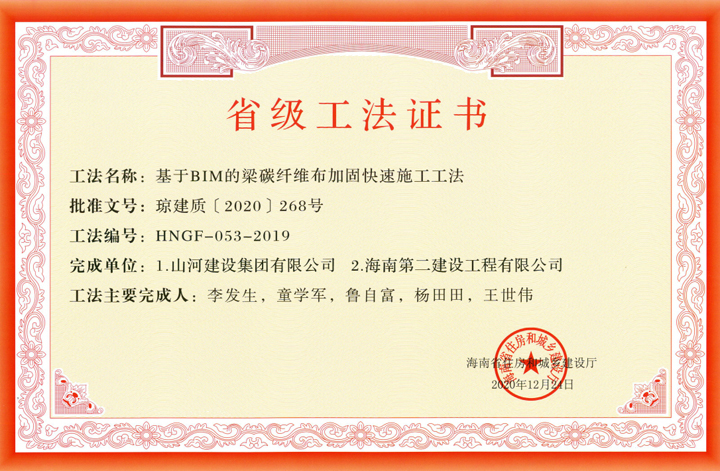 近日,海南省住房和城鄉(xiāng)建設廳公布了《2019年度海南省工程建設工法名單》,山河建設集團海南公司申報的《基于BIM的梁碳纖維布加固快速施工工法》成功獲評。