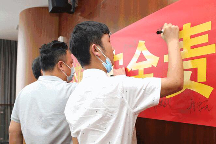 筑品質山河,成百年基業,是集團上下的共同愿景,更是山河人行穩致遠的實際行動?;顒幼詈蟮陌踩兄Z簽名儀式上,與會人員依次上前,在印有“落實安全責任 推動安全發展”主題的紅色條幅上簽下自己的名字,把承諾寫下來,記心上,以行動履行崗位職責,堅定信心做好安全生產工作。