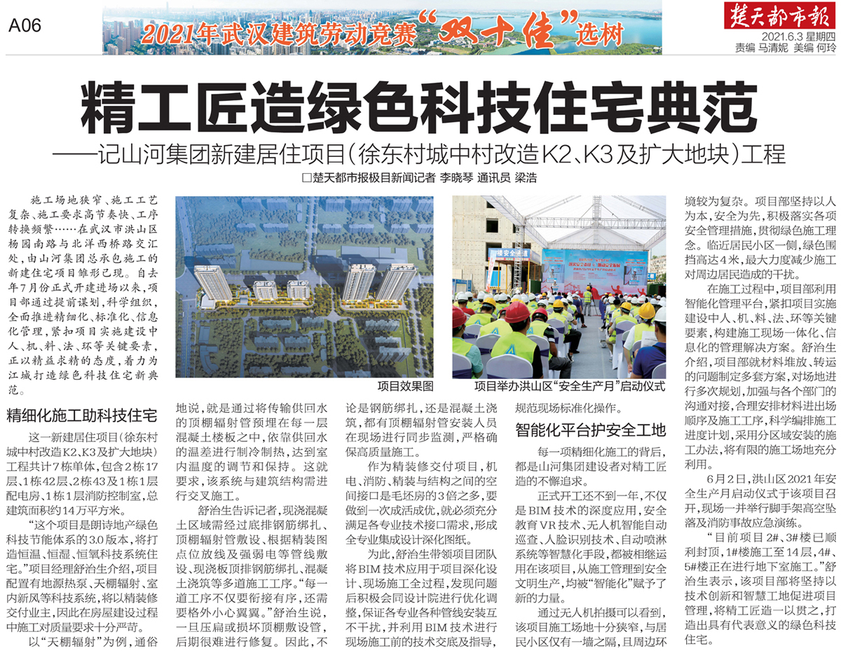 施工場地狹窄、施工工藝復雜、施工要求高節奏快、工序轉換頻繁……在武漢市洪山區楊園南路與北洋西橋路交匯處,由山河集團總承包施工的新建住宅項目雛形已現。自去年7月份正式開工以來,項目部通過提前謀劃,科學組織,全面推進精細化、標準化、信息化管理,緊扣項目實施建設中人、機、料、法、環等關鍵要素,正以精益求精的態度,著力為江城打造綠色科技住宅新典范。