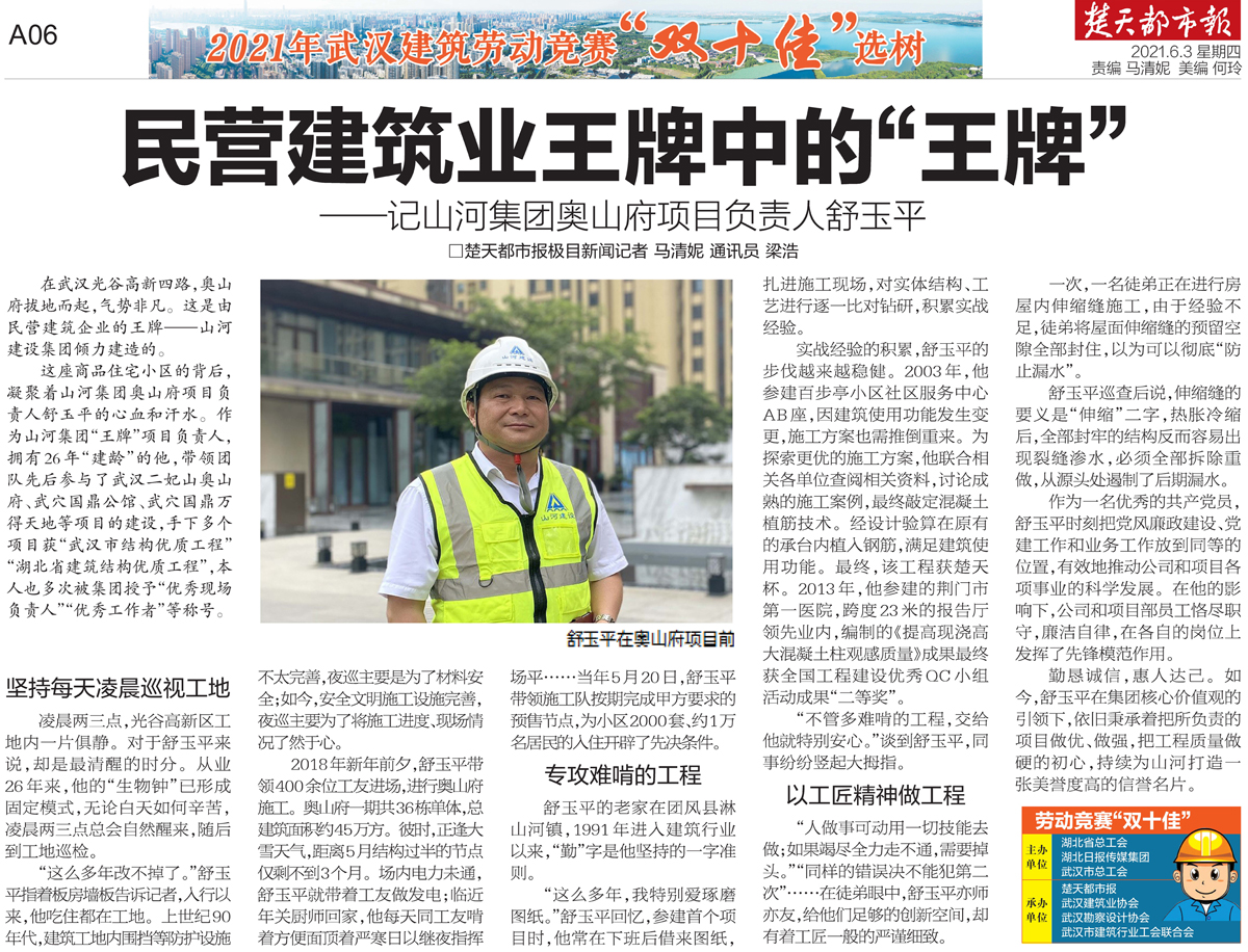 勤懇誠信,惠人達己。如今,舒玉平在集團核心價值觀的引領下,依舊秉承著把所負責的項目做優、做強,把工程質量做硬的初心,持續為山河打造一張美譽度高的信譽名片。