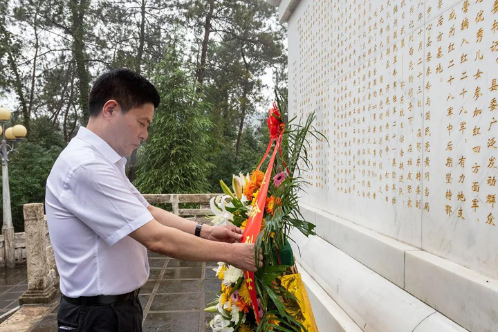 走過149級長長的臺階,雄偉莊嚴的革命烈士紀念碑映入眼簾。集團兩名黨員代表抬著花籃緩步向前,擺放到紀念碑基座上,黨委書記程理財上前仔細整理緞帶,全體黨員向烈士紀念碑深深鞠躬,表達了無限的敬意與懷念。天空中的雨簌簌而下,如泣如訴,也在為烈士致哀。