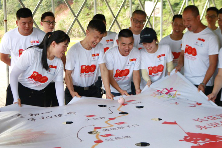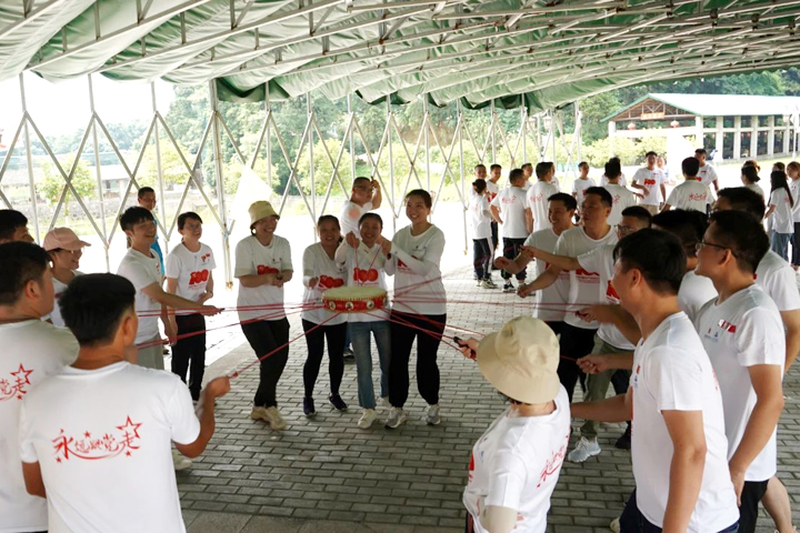 接下來,大家同聲齊唱《沒有共產黨就沒有新中國》,嘹亮的歌聲盡顯豪邁氣勢,燃起濃濃的愛國熱情。參訓人員分成6隊,并制定了隊歌、隊徽、隊旗、隊伍造型,正式開始比拼。在“長征”拓展訓練中,隊員們再一次熟悉了黨史,感受長征之路的曲折艱難,重溫新中國成立以來的重大事件,激發了奮勇爭先的干事創業熱情。