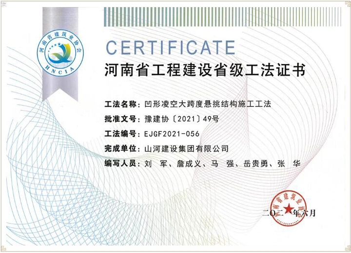 近日,河南省建筑業(yè)協(xié)會公布了《2021年度第一批河南省省級工法名單》,山河建設(shè)集團(tuán)河南公司申報的《凹形凌空大跨度懸挑結(jié)構(gòu)施工工法》成功入選,被認(rèn)定為河南省工程建設(shè)省級工法。