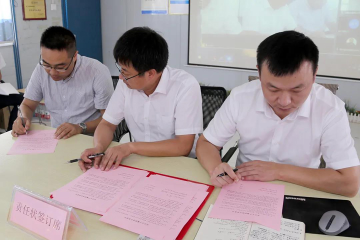黃超恒、汪俊臣與各在建項目負責人簽訂履職責任承諾書。各項目部向公司鄭重承諾,堅決遏制安全事故,全面完成2021年度安全生產(chǎn)責任目標。