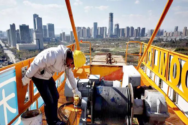 昆明龍四地塊棚改項目施工人員在檢查塔吊