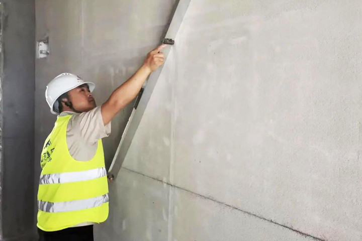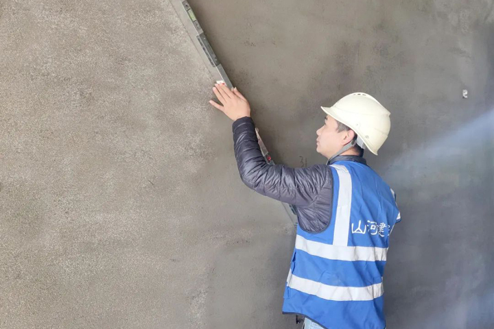▲新余聯發永康狀元府項目實測員在檢查墻面平整度