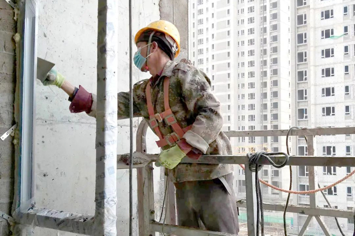 ▲西安龍發天泉灣項目工人在給窗框收口抹灰