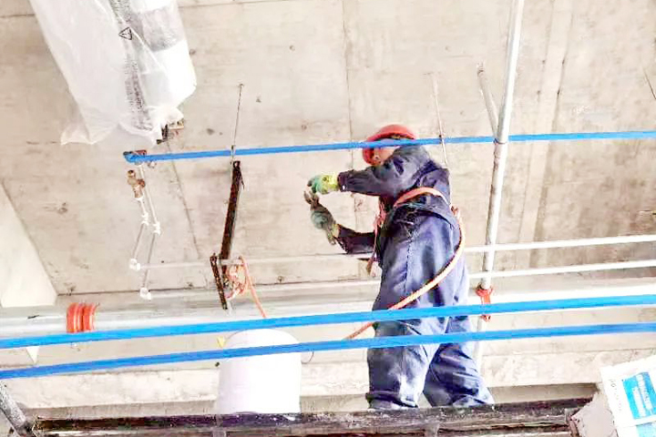 ▲遂川碧桂園項目抹灰班組工人進行石膏抹灰沖筋