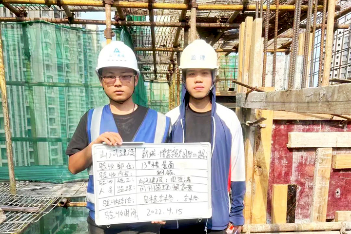▲江門市新城博富領會國際二期項目代表和監理單位代表舉牌驗收