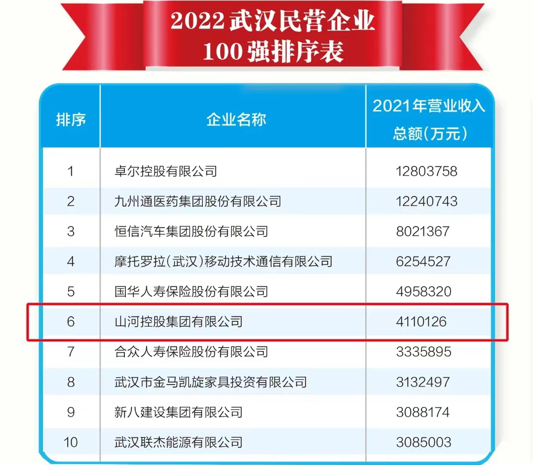 8月19日,2022武漢民營企業100強、民營制造業企業50強發布會暨金融服務民營企業高質量發展大會在武漢會議中心召開。大會發布的“2022武漢民營企業100強”榜單上,山河集團名列第6位。