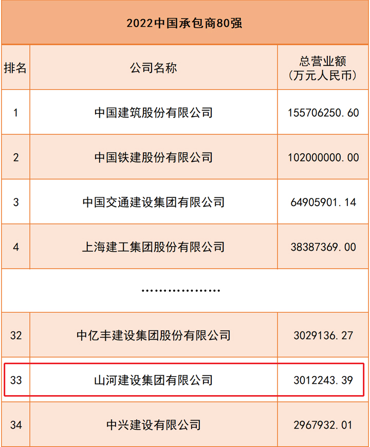 會(huì)上公布的“中國承包商80強(qiáng)”榜單上,山河建設(shè)集團(tuán)名列第33位。2022年度“中國承包商80強(qiáng)”以2021年度企業(yè)工程承包營業(yè)收入作為主要排名依據(jù),展示了新一屆中國建筑業(yè)行業(yè)領(lǐng)軍者的風(fēng)采。