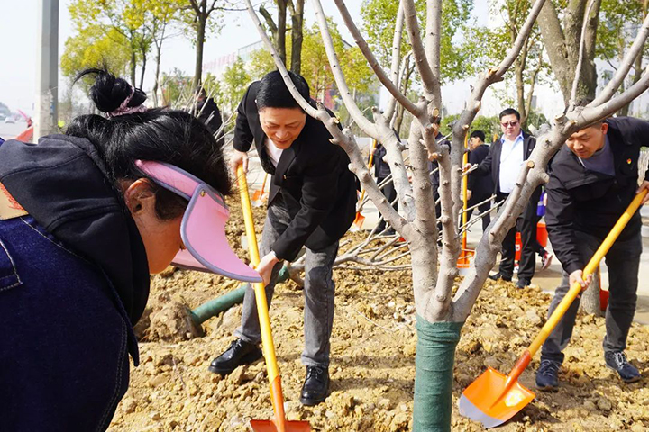 揮鍬鏟土、扶苗填壓、培土澆水……大家分為三人一組,通力合作,配合默契,種下一棵棵象征生機與希望的苗木。經過一番辛苦勞作,一株株樹苗列成整齊的隊伍,迎著和煦的陽光昂首屹立,呈現出一片濃濃的春意。它們將在建設者的呵護下蓬勃生長,扮靚城市顏值。