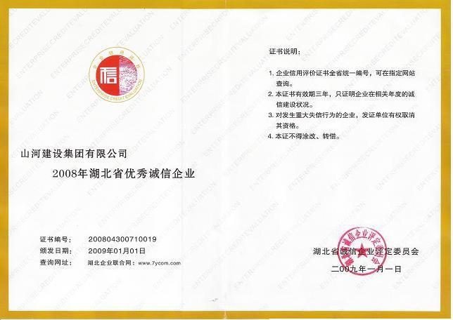 湖北省企業聯合會和湖北省企業家協會于2009年元月1日發布2008湖北省優秀誠信企業名單,山河集團再度金榜題名。自元月份以來,山河集團已經獲得了納稅信用等級A級納稅人、湖北省建筑業企業綜合實力20強、武漢地區建筑業優秀企業等多個榮譽。此次獲獎可謂錦上添花,更是對山河集團誠信經營理念的肯定。