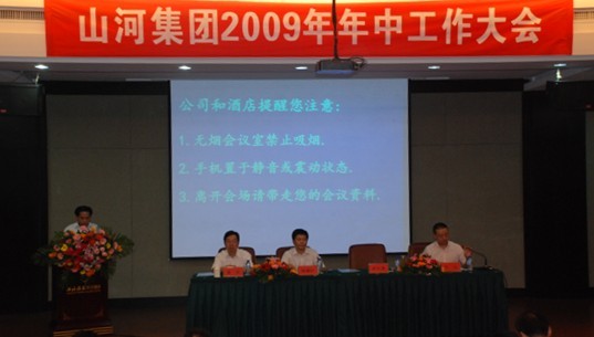 2009年9月19日-20日,山河集團2009年年中大會在江西廬山西海度假村會議中心召開。集團公司董事長程理財、黨委書記舒先厚、總經理黃林以及各黨委副書記、副總經理、三總師和集團公司辦公人員、區域公司及子公司主要負責人、集團公司項目經理近兩百人齊聚一堂,共商山河發展大計。